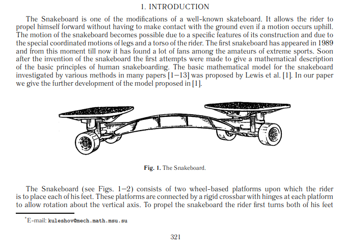 A snakeboard is similar to a skateboard but the wheels are attached to pivoted platforms that can be rotated by the rider’s feet. Forward motion is generated by coordinated twisting of the body and platform angles. This is easier said…